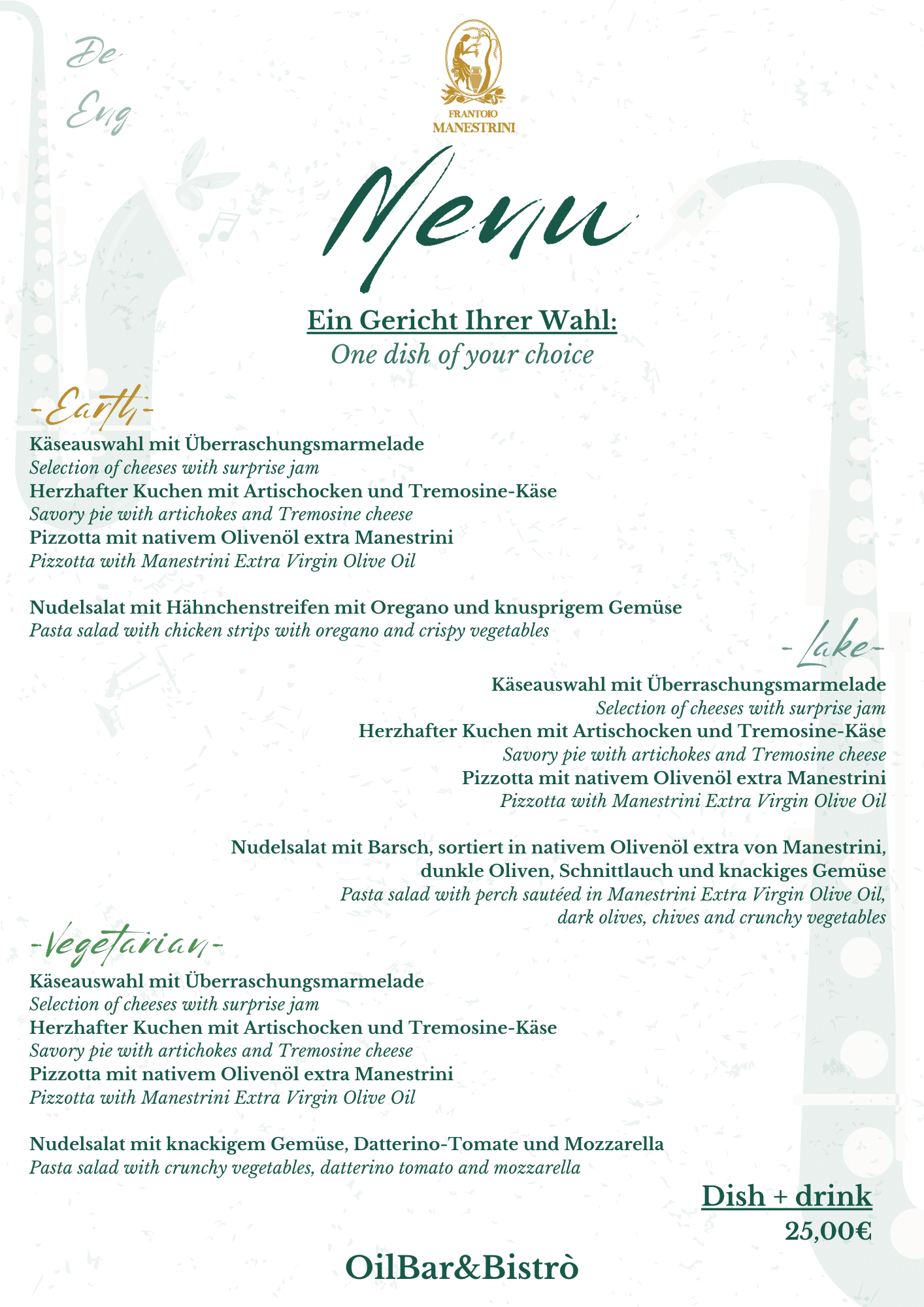 Genießen Sie die Gardaseespezialitäten mit einem unserer Menüs und lassen Sie sich von der einzigartigen Atmosphäre für nur 25 €, inklusive Getränk, mitreißen!